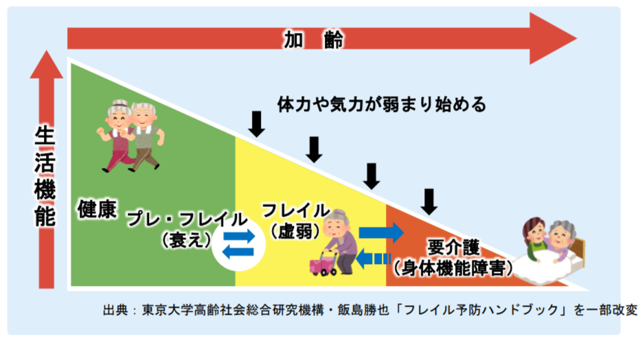 フレイルとは介護の前段階で、放置して置くと介護になりやすい状態のことをいいます。