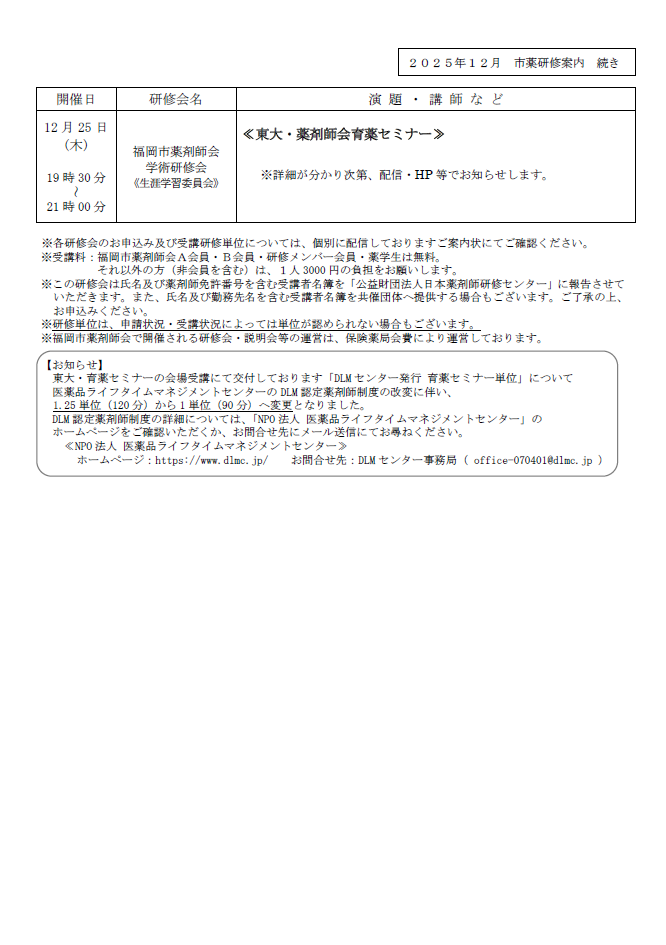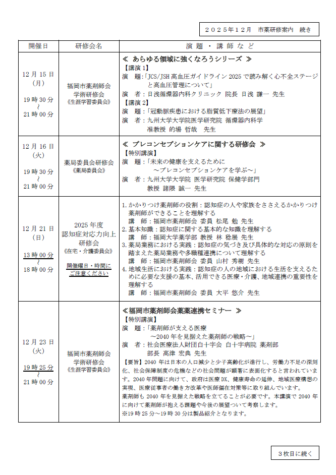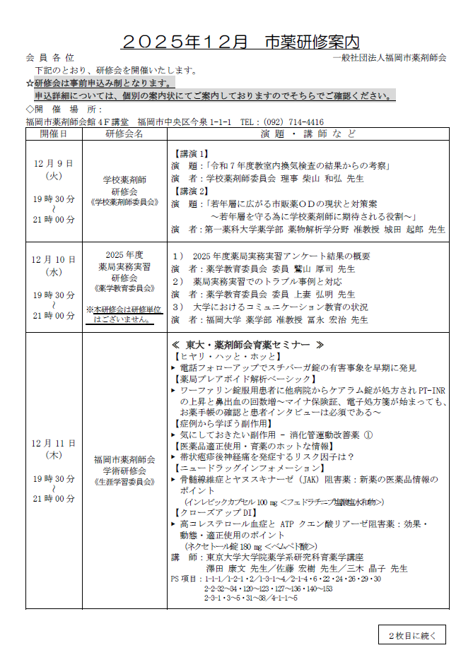 2025年12月 市薬研修案内について