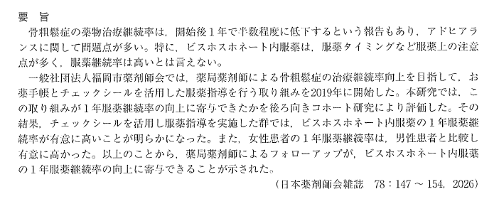 研究タイトル:「お薬手帳を活用した骨粗鬆症治療薬の服薬継続率向上を目指した