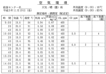 その中の一つ、福岡市教育委員会・学校給食課から委託されている学校給食センター職場環境調査は、市内4ヶ所、那の津・有田・柳瀬・箱崎の各センターで学期毎に1回、年3回実施している。ただし、騒音環境調査については、年1回の測定になっている。