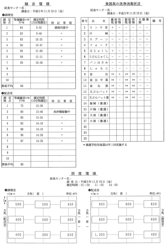 次のような項目を3〜5名の会員さんで調査しているが、その他に数名の新人学業さんも研修のために参加されている。今回の調査から「騒音環境」が、従来のA特性騒音レベルから、等価騒音レベルになった。また測定地点も、従来の定位置で20分間隔に14回測定する方法から、調理室・配送室のそれぞれ7地点を移動しながら10分間測定する方法に変わったのでここに報告する。