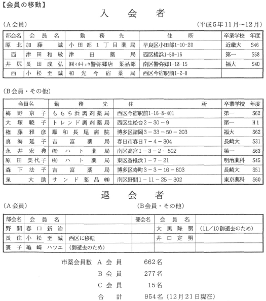 最後に、本年は役員改選の年である。会営薬局の建設に尽力していただいた現役員諸鬼に感謝申し上げるとともに、次期執行部で運営される会営業局には、若い世代の意見を取り入れ、有意義な運営がなされるよう希望してごあいさつと致したい。