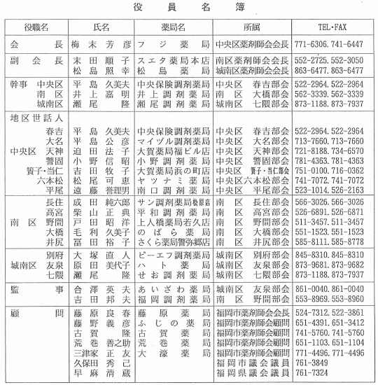 それと、薬物乱用がだんだん低年齢化しているということで、今後も覚醒剤、シンナー等の防止対策が重要な事業になってきます。そのほか、血液確保事業という事業もありますが、今後、最も私どもが重点事業として進めたいものに、医薬分業の推進というのがございます。全国的にかなり高い分業率になっておる訳ですが、その分業の質といいますか、その辺が非常に問題があるという事でございます。幸い、福岡市は平成6年に市薬薬局を開設されておりまして、ここを中心に備蓄、研修、情報、そういったことを積極的にやっているという事 で、面分業の体制は既に福岡市の場合はできていると思っているわけですが、今後とも私ども行政と薬剤師会が一体となっそ薬局の受け入れ体制あるいは質の高い薬剤師を育成するための研修を実施しながら地域医療に貢献できるかかりつけ薬局育成を積極的に進めていきたいと考えております。