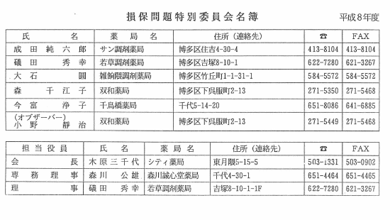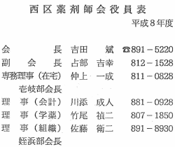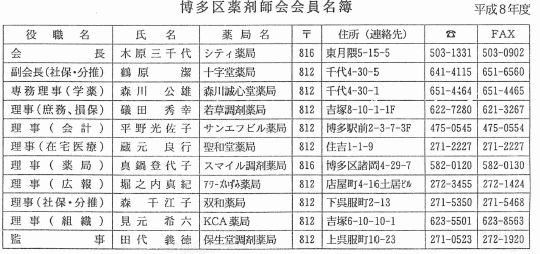 福岡県医療協議会で3月に決定されました、地域保健医療計画の中に医薬分業の推進及びかかりつけ薬局の育成強化ということが明文化されております。 平成9年度の地域医療法の施行に伴って、より具体的なお話が出てくると思います。 やはり、いろんな面で、薬剤師そのものが認知されている。 これは大変喜ばしいことではございますが、同時に責任も重くなっているという事を、より認識して頂かなければいけない時期になっているのではないかと思っております。