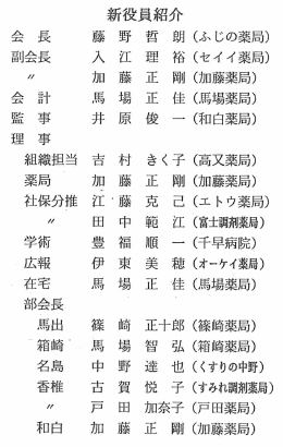 また、県薬も3月17日に代議員会を開催し、会長、副会長並びに監事等の先生方は再任ということで、新執行部が発足しております。 特に、この2年間は、副会長の責任体制の強化という事で、各副会長の責任体制のもとに、各委員会、各業務の遂行をやっていくという事をしております。