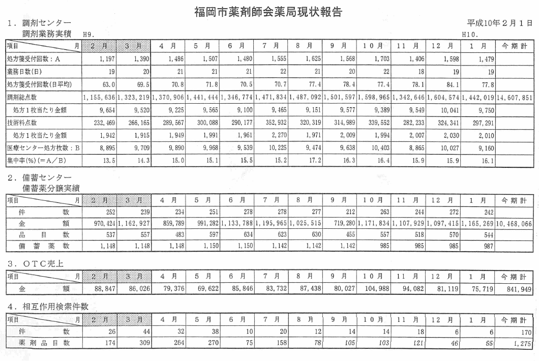 先日、福岡市内科医会の先生方との話し合いがありました。内容は『院外処方せんを発行したいが、どこで処方せんを購入したらよいか判らない。隣りに薬局がない』『薬局でどういう服薬指導をしているか気になる』『処方せんがどこに行くか不安である』又、『薬剤師会の情報を内科医会雑誌に掲載して欲しい』等でした。2〜3年前には考えられなかった事です。