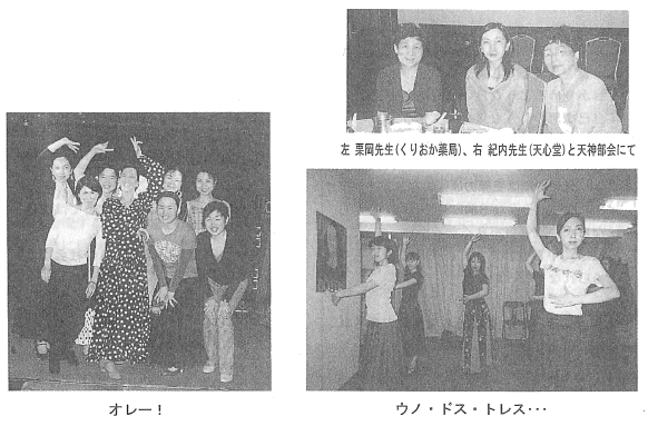 残業や家事を片付けて駆けつける彼女たちは皆たくましく、よく喋り、よく食べる。つくづく女は元気だなと思う。バスを待っている時も、信号待ちしている時も頭の中は無意識にウノ・ドス・トレス。カウントを取っている。レッスンの帰り道は道端でも復習のため踊る。まだロボットのような“カクカク”している下手くそな時から他団体の発表会でフラメンコと銘打って踊っていた。これは相当インチキくさかった。どんたくでも、知らない人の結婚式でも、私達は踊る。下手なのに強気だ。素人は恐い。